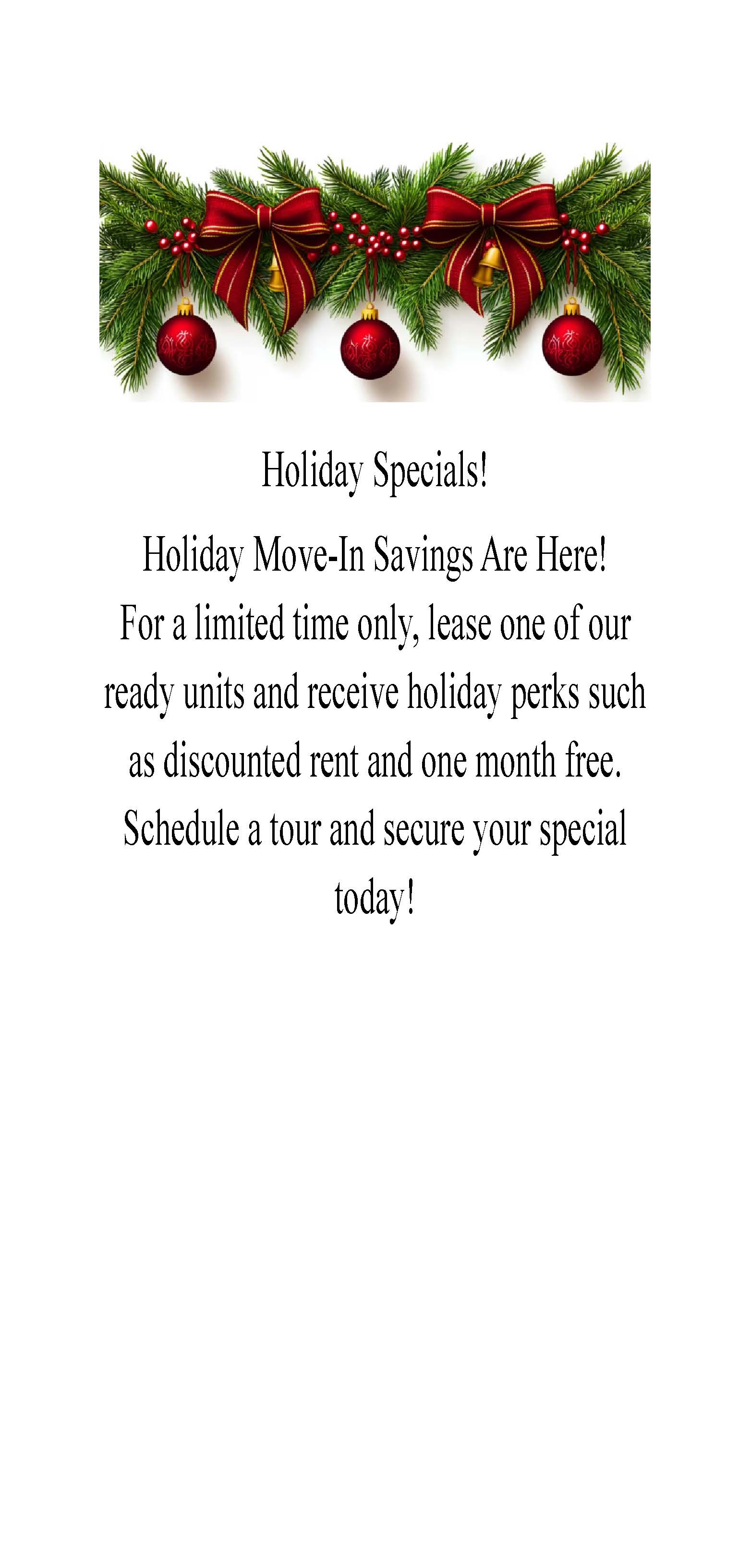 Holiday Specials! Holiday Move-In Savings Are Here! For a limited time only, lease one of our ready units and receive holiday perks such as discounted rent and one month free. Schedule a tour and secure your special today!